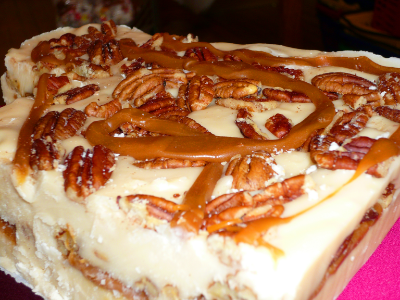 Chunks of nutty pecans layered in creamy, hand made,& vanilla fudge with smooth, luxurious caramel… it's like a white chocolate tortoise… YUM… get some of them, too!