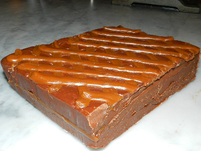 Smooth, buttery caramel oozing and gooing out between layers of creamy, smooth hand made chocolate fudge