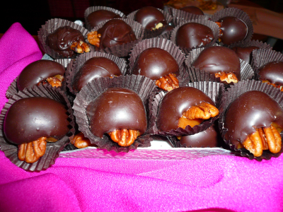 Hand made vanilla caramel the size of a turtle egg, a little pecan head just peeking out of a dark chocolate shell… hurry get 'em before they get to the water