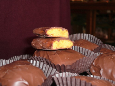 Often called sea foam, a firm turning chewy molasses candy dipped in milk chocolate