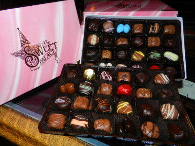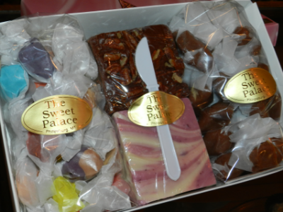 1 pound assorted fudge, 2 flavors, 1/2 lb hand wrapped caramels ,& 24 piece & assorted chocolates, 1/3 lb. salt water taffy. All wrapped in our Sweet Palace signature pink box with ribbon. Due to seasonal availability, please allow us to select two delectable fudge flavors for you. For quantities of 10 and more, please call, 1-888-793-3896, so we may personally see to your gifting needs.