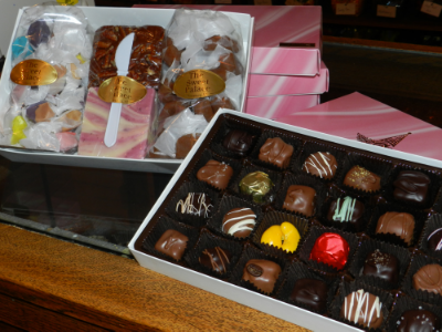 Now this is the ultimate gift! 24 piece assorted chocolates;15 pieces milk and dark cherry cordials, 15 pieces of assorted panned chocolates, 1 lb assorted taffy, 1 lb assorted homemade caramels, and 1 lb fudge… 2 1/2 lb flavors. Whomever is the recipient of this, will feel like royalty! Please call, 1-888-793-3896 to find out how we can help with large orders.